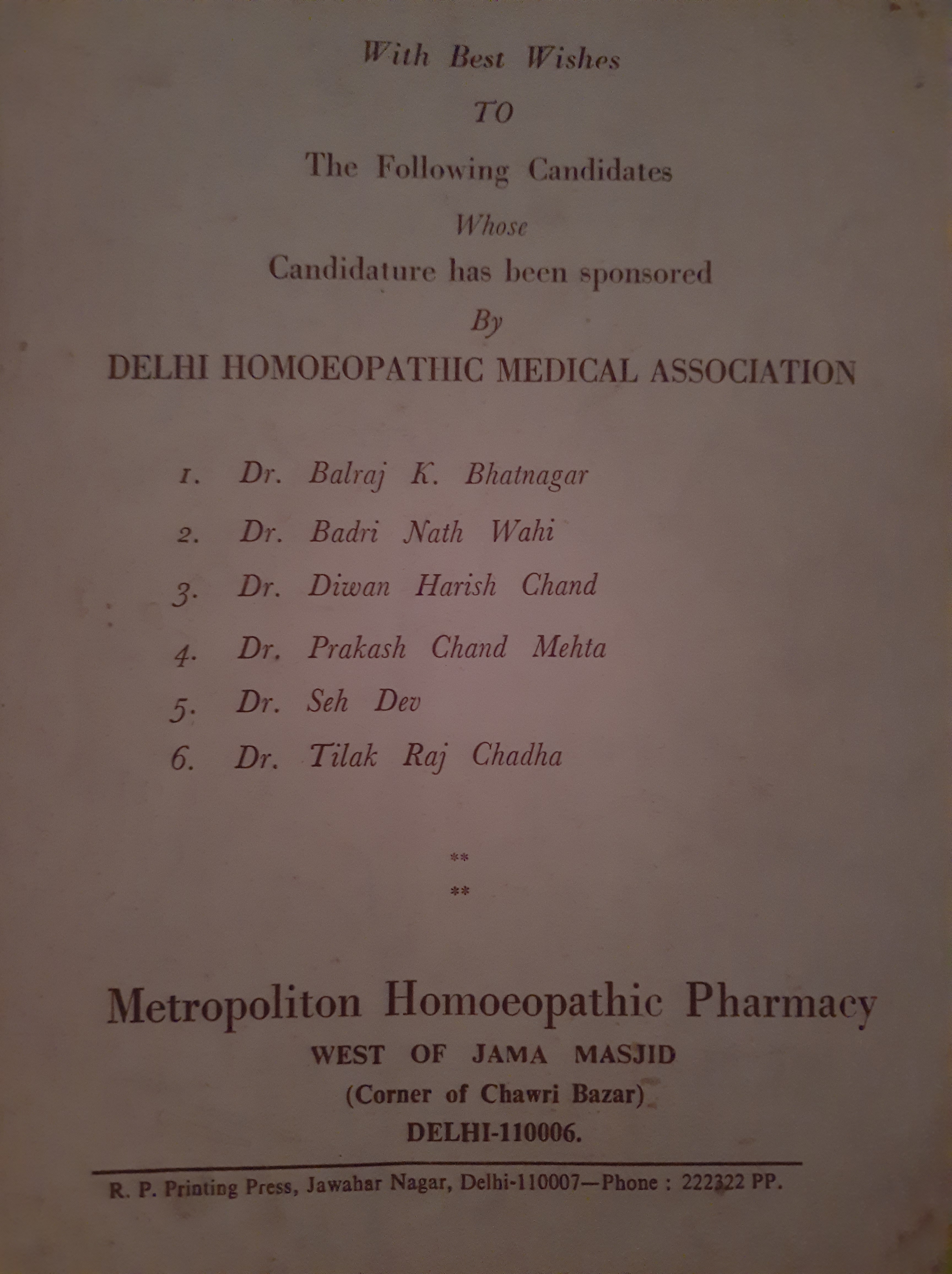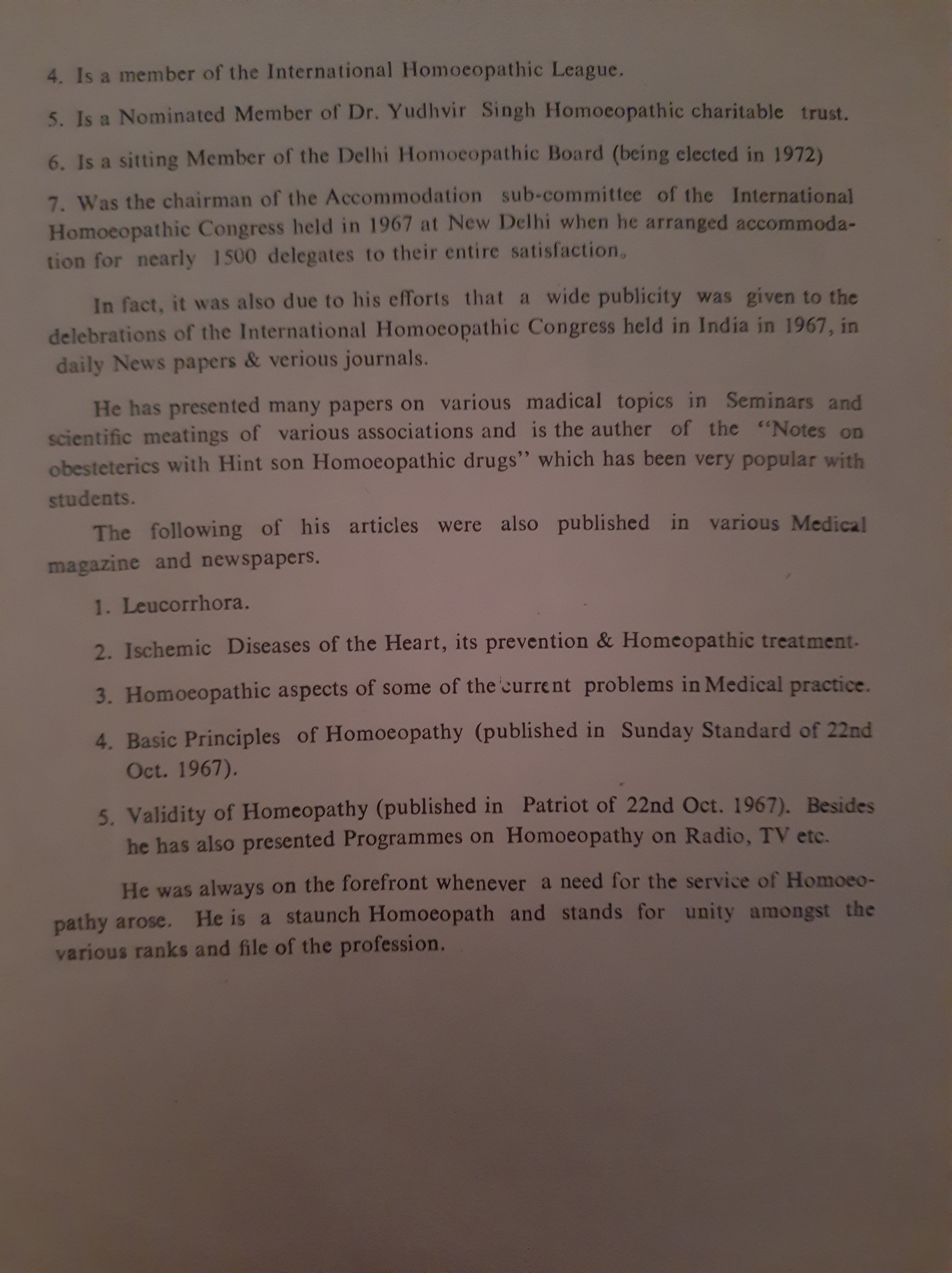 President of Delhi Homeopathic Medical Association 1968-1974 (Elected Twice)