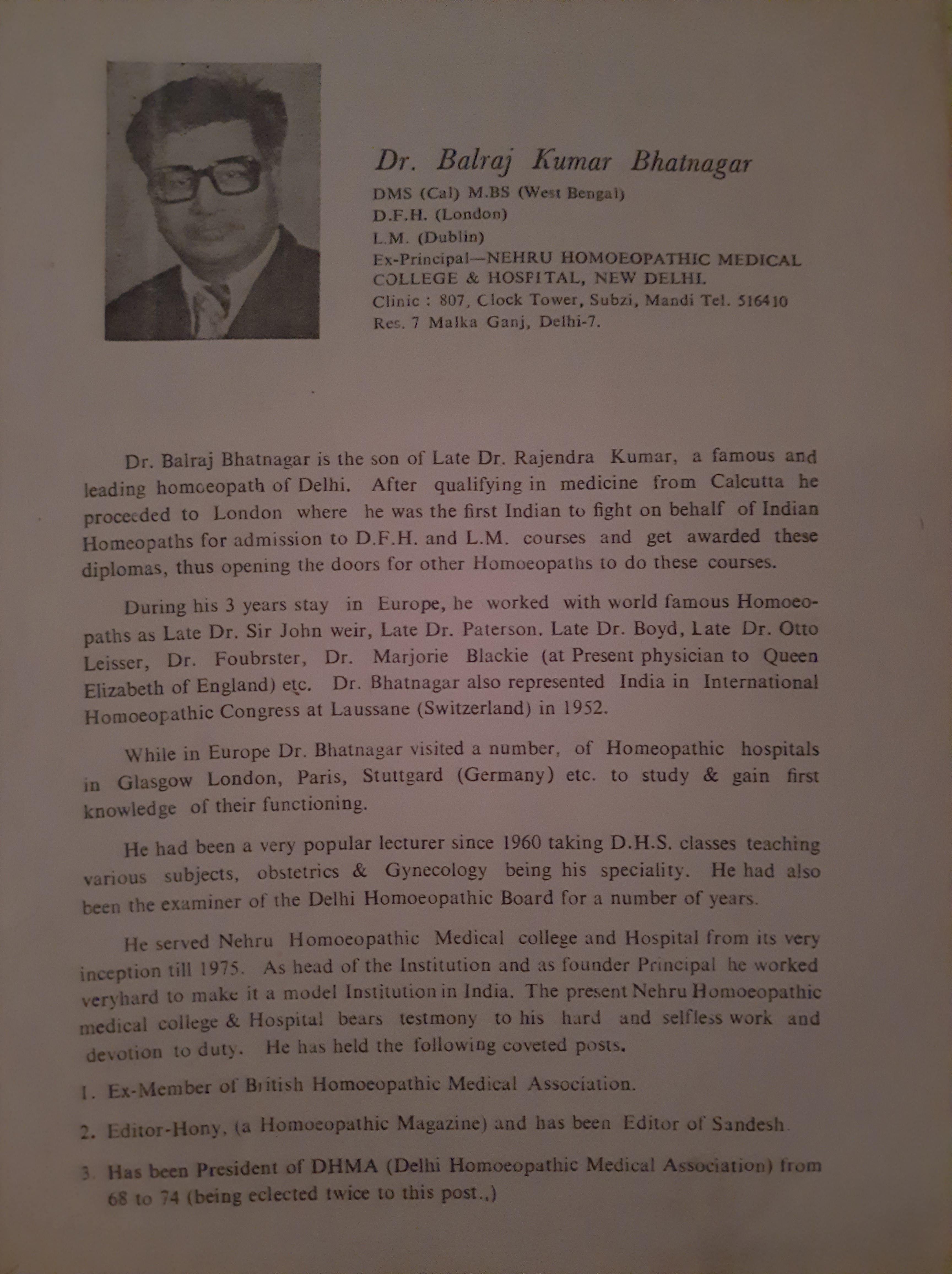 Dr. Balraj Bhatnagar is the son of Late Dr. Rajendra Kumar, a famous and leading homeopath of Delhi. After qualifying in medicine from Calcutta, he proceeded to United Kingdom where he was the first Indian to fight on behalf of Indian Homeopaths for admission to D.F.H. and L.M. courses and get awarded these diplomas, thus opening the doors for other Homeopaths to do these courses.